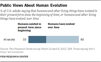 A recent Pew Research survey shows that 60% of Americans believe that “humans and other living things have evolved over time” while 33% of Americans reject evolution and believe that “humans and other living things have existed in their present form since the beginning of time”. But about half of those who believe in evolution believe it’s “due to natural processes such as natural selection”. Only 32% of Americans express a belief in pure Darwinian evolution, while 24% accept that “a supreme being guided the evolution of living things for the purpose of creating humans and other life in the form it exists today.”