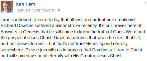 Here’s a pretty classy response from Ken Ham of Answers in Genesis when he found out that Richard Dawkins had suffered a minor stroke.