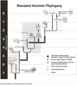 I attached a standard hominin phylogeny. It supposedly shows what fossils are in the human lineage, and, as you can see, many of the connections are without clear fossil evidence… it’s merely speculation. Why, then, accept evolution without clear evidence? I think evolution is best to be rejected as a modern myth.