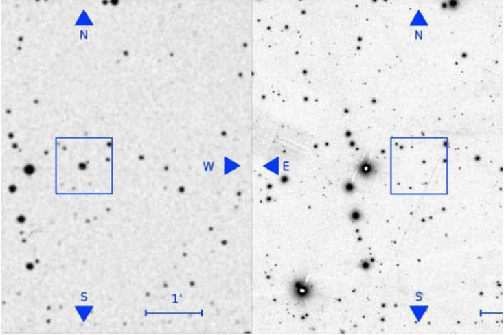 Where’d it go? An image taken in the 1950s (left) shows a large object at center that doesn’t appear in an image of the same field taken more recently. (Villarroel et al.)