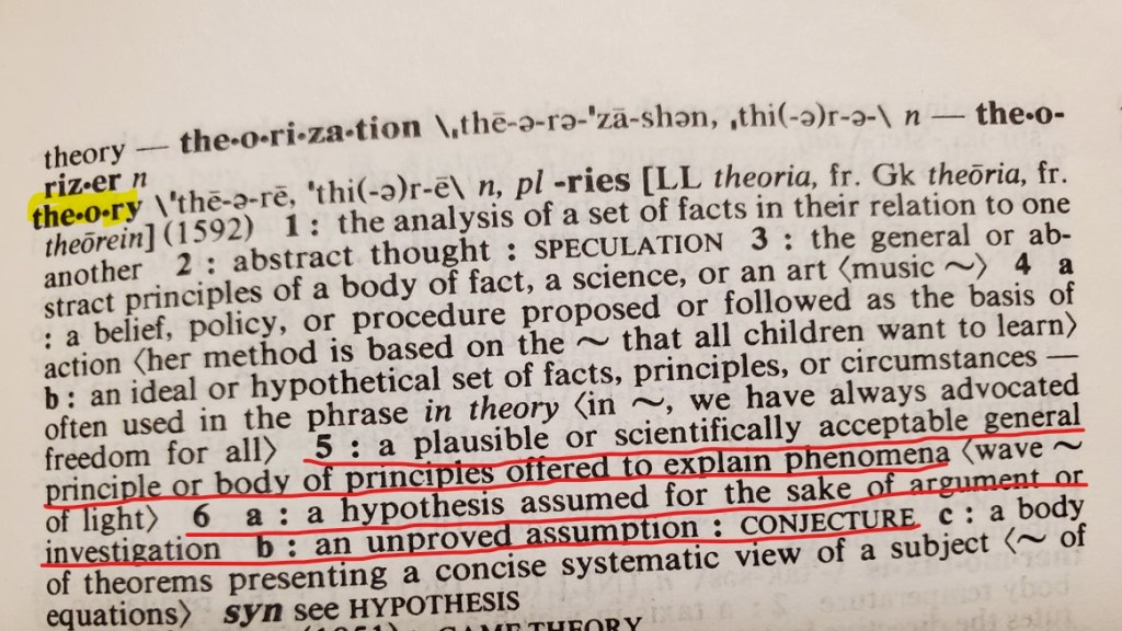 While it may be true that evolutionary scientists use the definition proposed by the author, they do so out of necessity or self-preservation. Few evolutionary scientists would agree to a definition that doesn’t align with their perception, or one that undermines evolution, right? I’d suggest the major problem is that evolutionary scientists are using a self-serving definition. Merriam-Webster offers additional definitions, including “an unproved assumption: conjecture.”